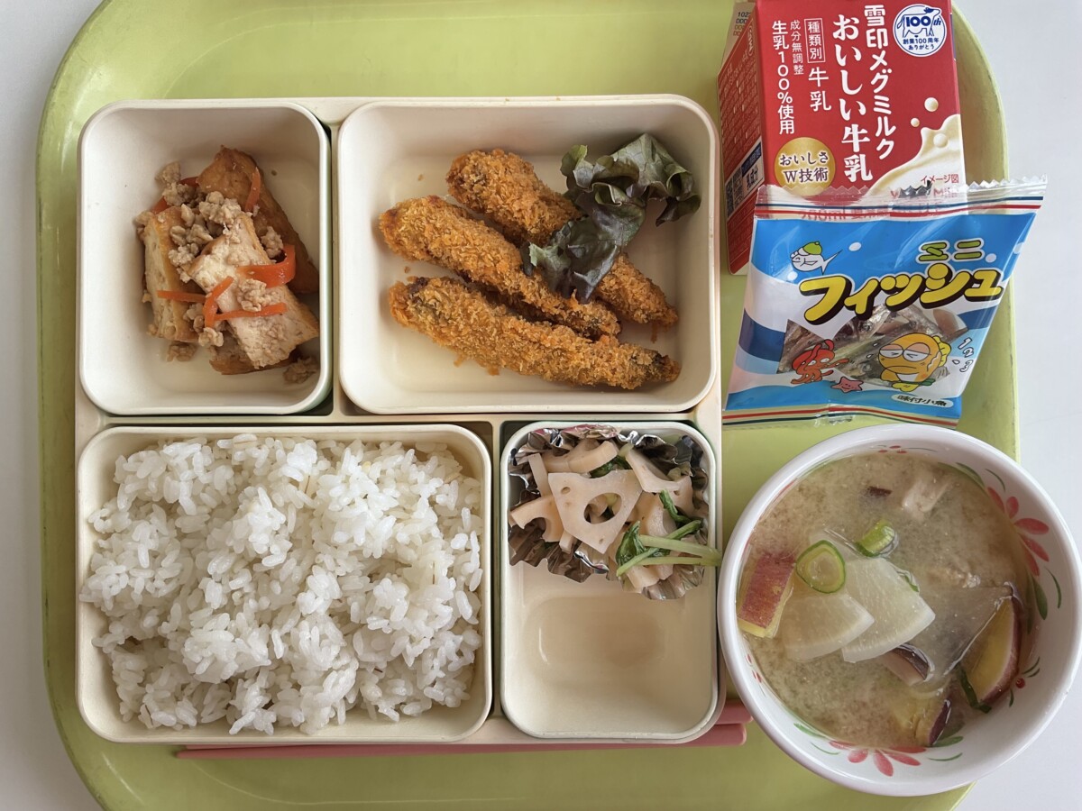 今日のさつま芋ごはんのさつま芋は、1年生が畑で育てたさつま芋を使用しています。品種は「紅あずま」です。甘くホクホクとした食感です。収獲して1か月程度冷暗所で保管すると追熟し甘さが増すようです。今年のさつま芋のお味はいかがですか。きっとおいしくできていると思います。