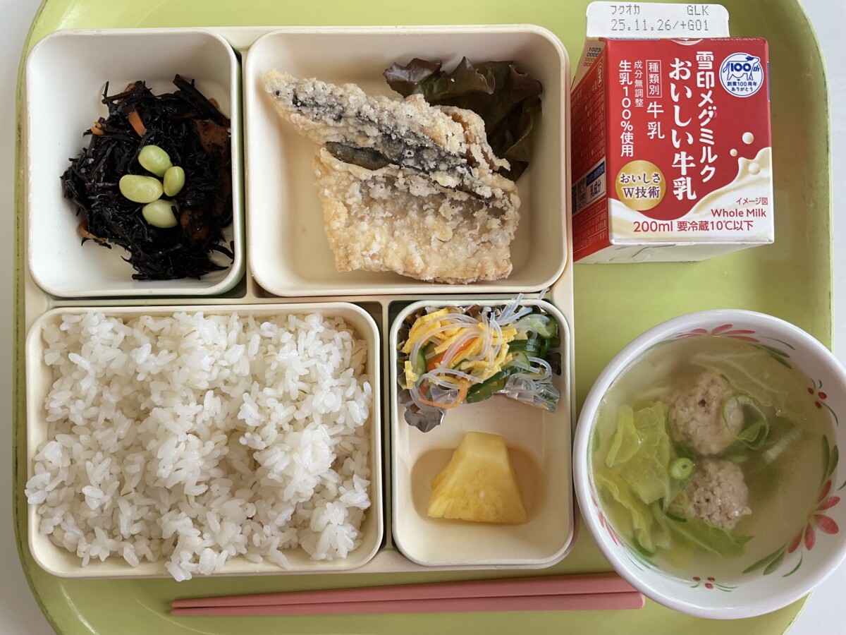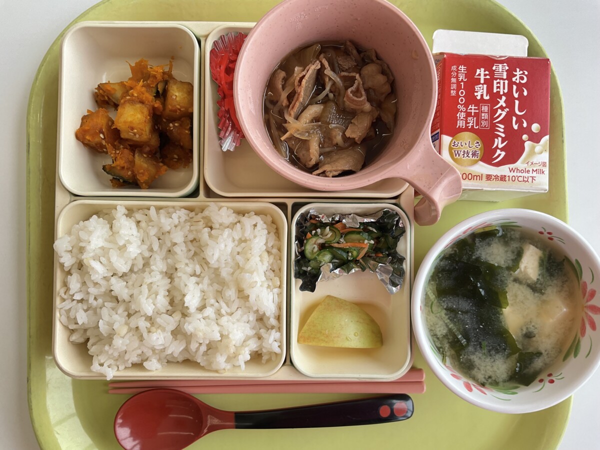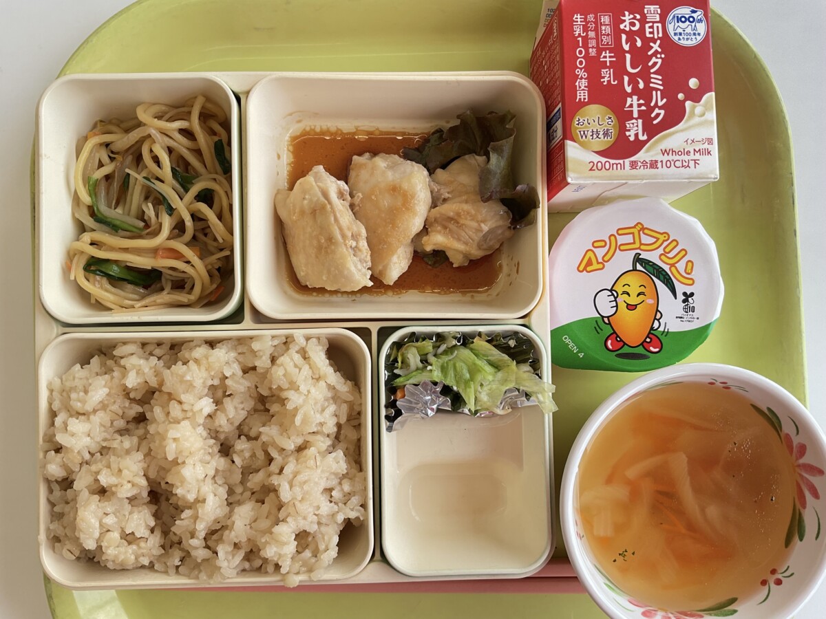 今日は世界の料理の日で「タイ」です。ガパオライス、ヤムウンセンです。ガパオライスとは香ばしく炒めたひき肉に、ピリッとスパイシーなホーリーバジルを合わせた、タイを代表する定番の人気ごはんです。ヤムウンセンは春雨とひき肉のスパイシー炒めです。給食では食べやすいように味付けをアレンジしています。この機会に世界の料理を調べてみてくださいね。