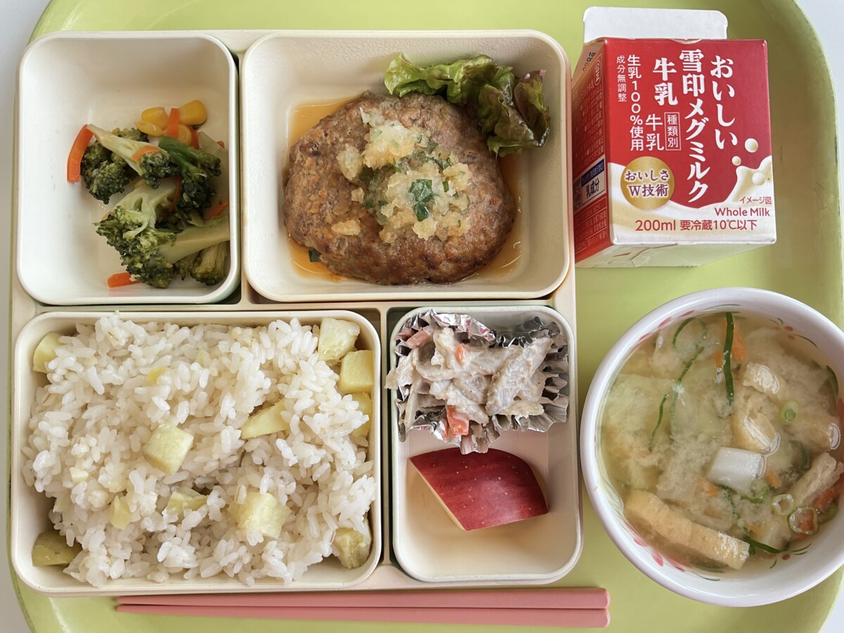 今日はLuckyDayの日です。班で1人のビーフシチューの中に、ハート♡に形取りした人参が入っています。マグカップを開けてハートの人参があったらラッキーですね。シチューはパンに付けて食べてもいいですね。毎日、バラエティーに富んだワクワクするような献立ですね!今日もおいしく頂きましょう♪