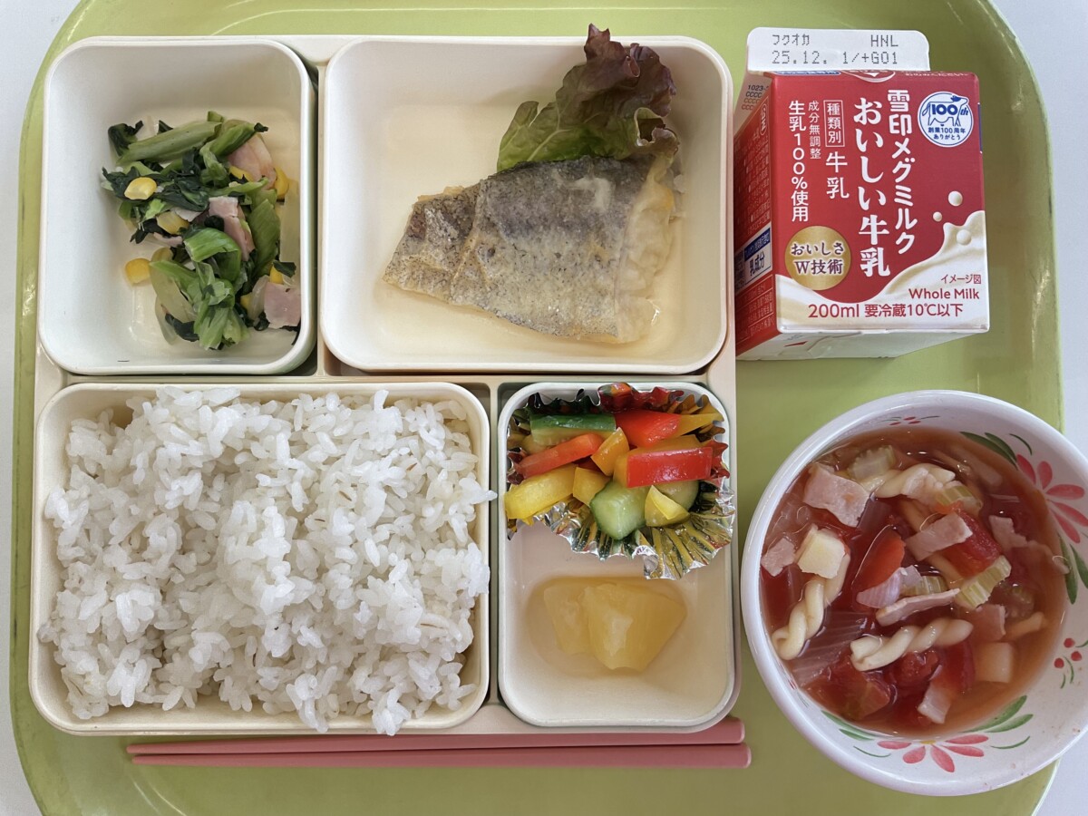 今日のスープはミネストローネです。ミネストローネスープはトマトや玉ねぎ、じゃがいも、セロリ、マカロニなどを加えた具沢山トマトスープのことです。寒い時期には温かい具沢山のスープや好まれます。11月に入り寒さも増してきました。自分で体調管理ができるように、食事面から身体を温める食べ物を選べると良いですね。