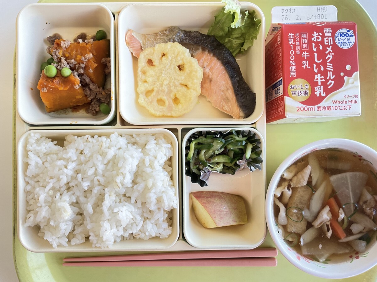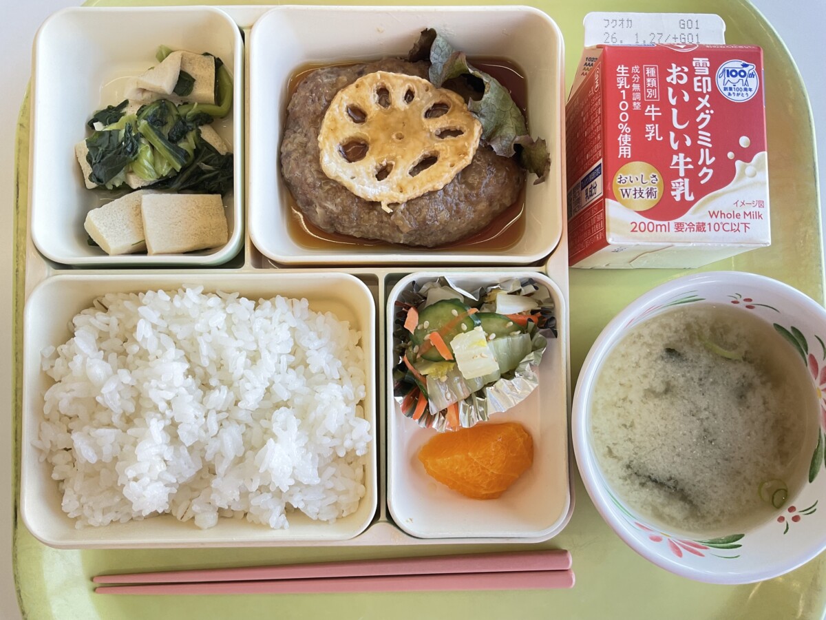 今日は給食アンケートで「好きな献立 第4位」のレンコンバーグです。れんこんは冬が旬の野菜でビタミンCや鉄分が豊富です。アクの成分のタンニンは、胃潰瘍や鼻血などの止血の効果もあります。お正月の食事で胃もたれしたこの時期に食べると、消化を促進してくれます。また、あえて食感を残す為に、大きめにカットしてお肉を混ぜ合わせました。おいしく頂きましょう。
