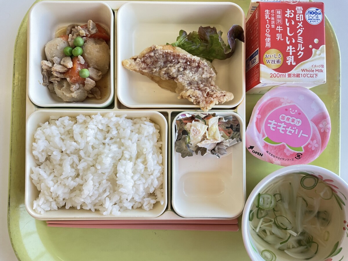 今日は赤魚の竜田揚げです。赤魚に、しょう油や砂糖、酒、しょうがで下味をつけて、片栗粉をからめて、油で揚げまし。魚の臭みをしょうがを加えることで柔らけることができます。お味はいかがでしたか?