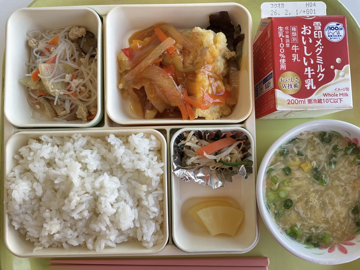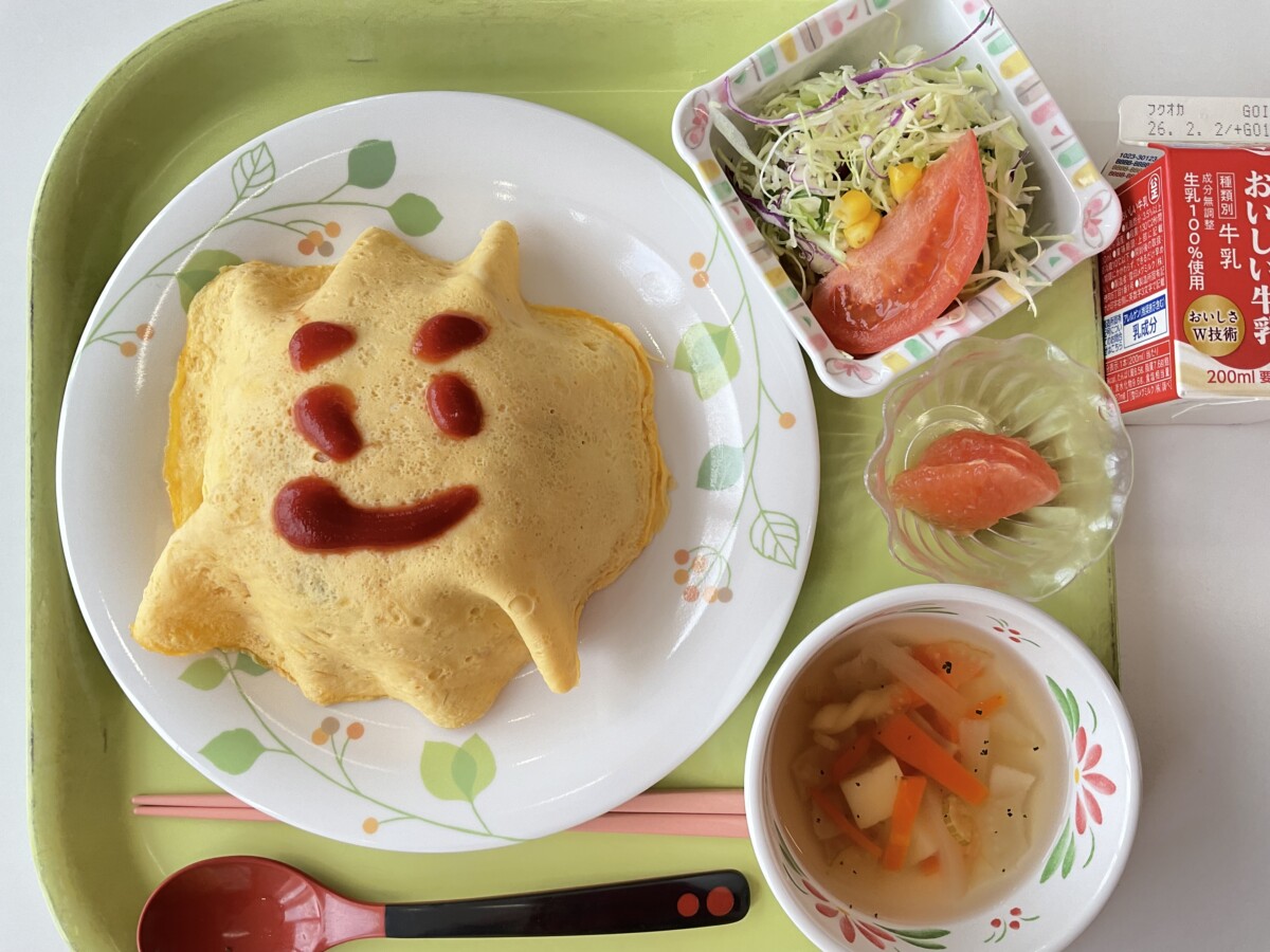 今日はオムライスです。3年生のリクエスト献立で1位に輝いた一品です。