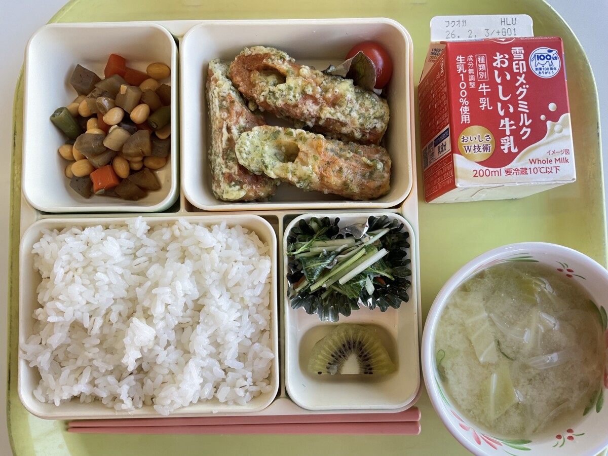 今日は給食アンケートで好きな給食ランキングで上位に挙がった「ちくわの磯部揚げ」です。てんぷら粉に青のりを加え衣を作り、ちくわにからめてふんわりと揚げています。ちくわの塩味と青のりの風味が美味しさを引き立てています。味わって頂きましょう!