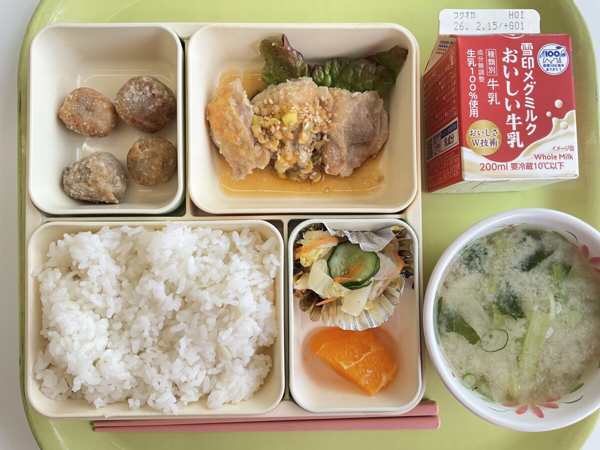 今日はとり天のジンジャーソースです。鶏肉にてんぷら粉をまぶし、油でさっくりと揚げています。しょうゆ、砂糖、酒、みりんの調味料におろし生姜を加え、さっぱりと仕上げたソースを絡めています。生姜の風味がとり天とよく合う一品です。今日は、ごはんがより一層すすむメニューですね。