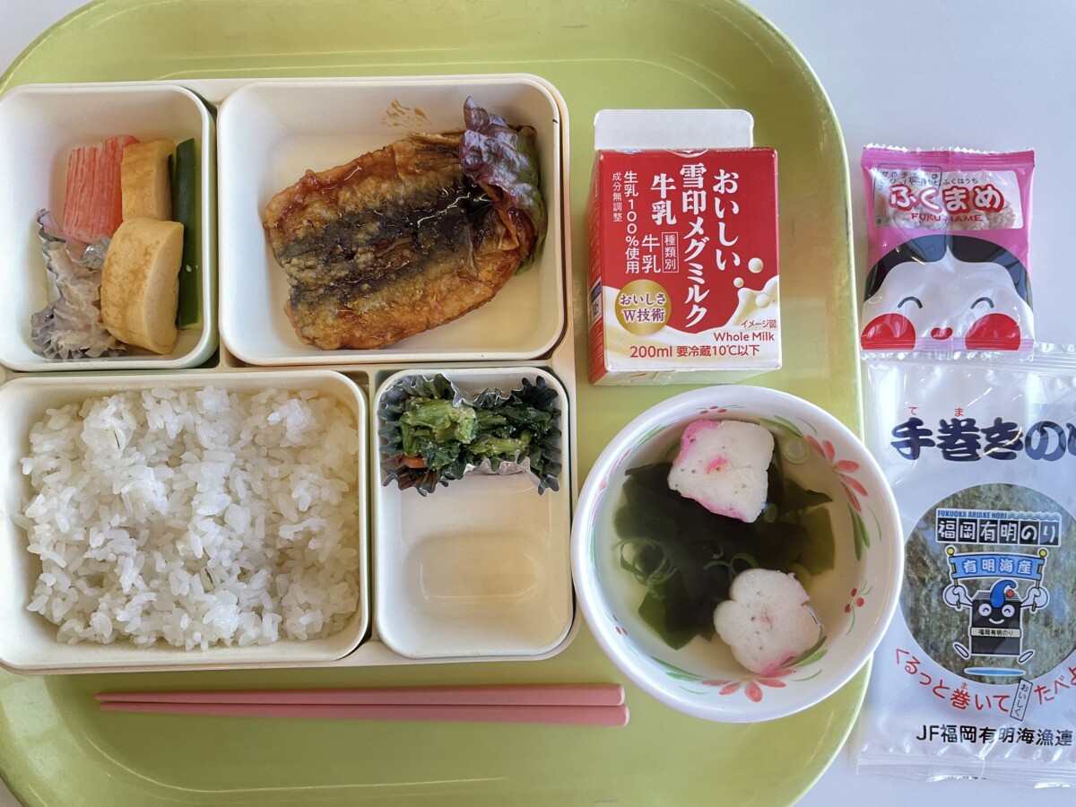 今日は新年最初の給食なので、お正月メニューです。出世魚「ぶり」を福岡の郷土料理の「がめ煮」白玉をお餅み見立てた「雑煮風すまし汁」、金運上昇・財運・商売繁盛を願う縁起物の「栗きんとん」など縁起の良い献立です。今年も、おいしく、健康な身体づくりを目指しましょう!