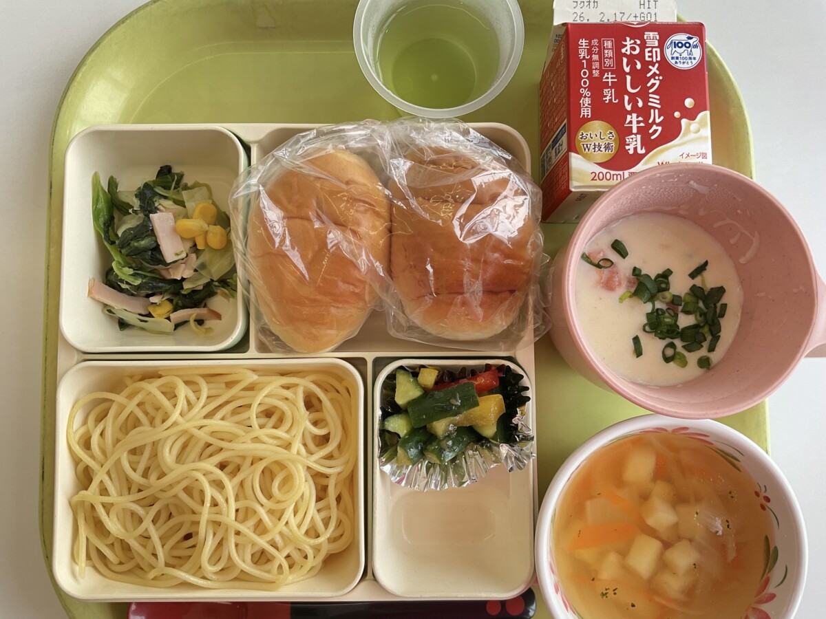 今日はクリームパスタです。みなさんの好きな給食アンケートで上位に入ったメニューになります。寒い時期にはクリーム系のメニューが好まれます。身体を温める効果があります。風邪は流行するこの時期は、特に栄養のある食事で免疫力をアップしましょう!