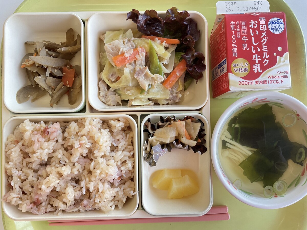 今日は梅じゃこご飯です。梅干しとちりめんじゃこをしょうゆと砂糖で味をつけて、ご飯に混ぜ込みました。梅干しの酸味とちりめんの風味がご飯ち溶け込みとても味わい深いご飯になっているかと思います。お味はいかがでしたか?