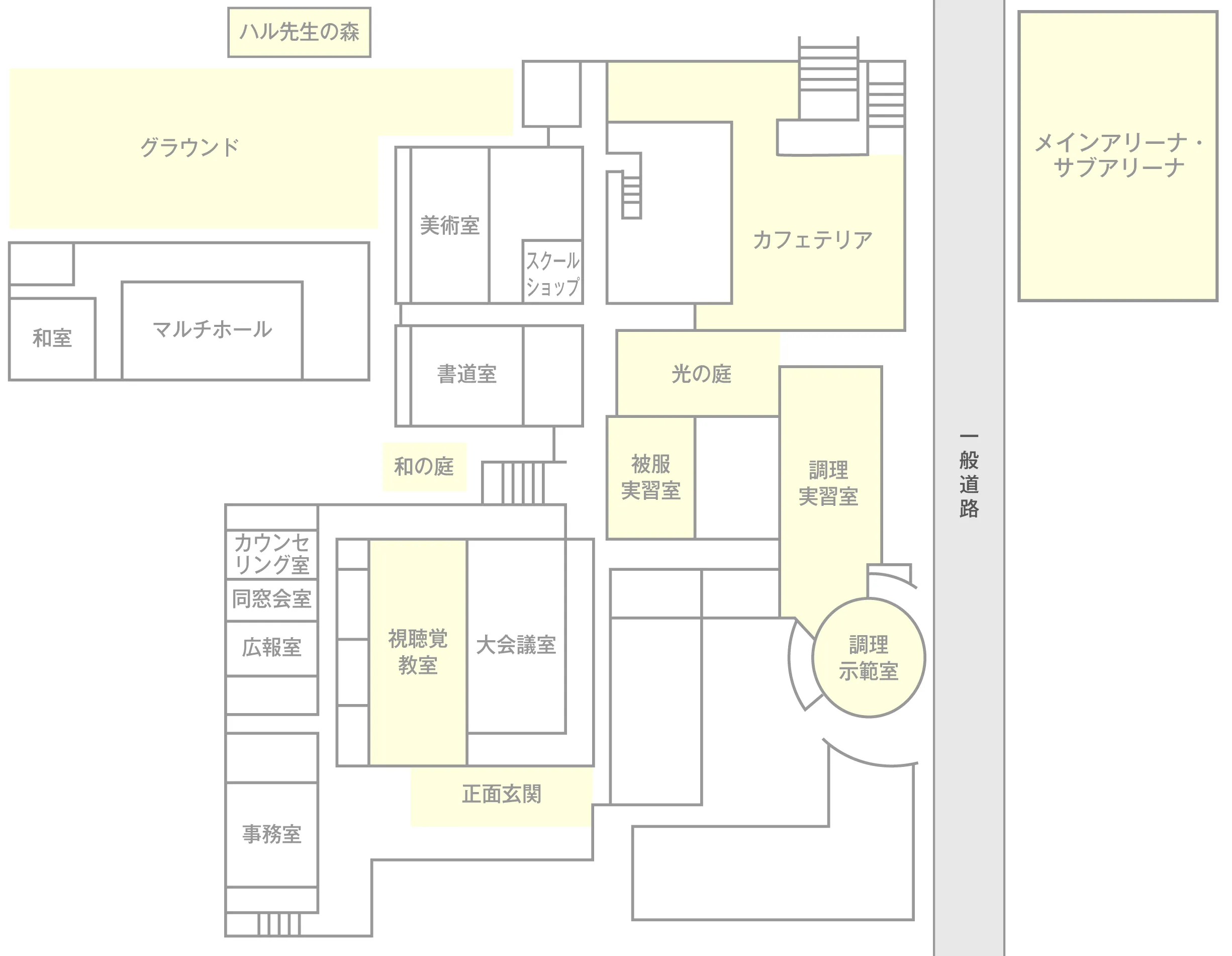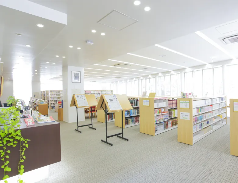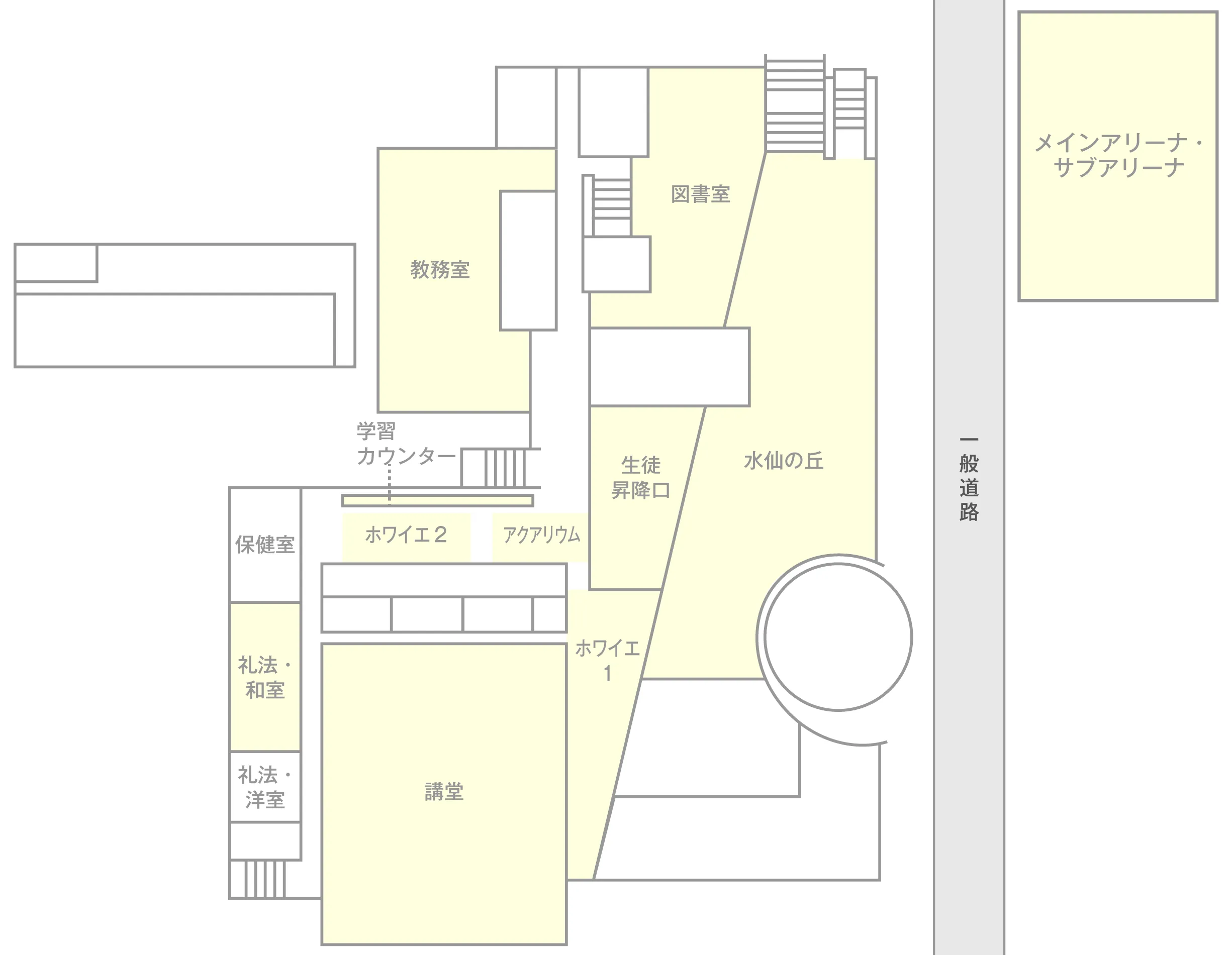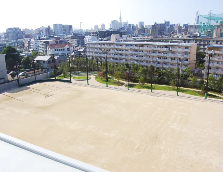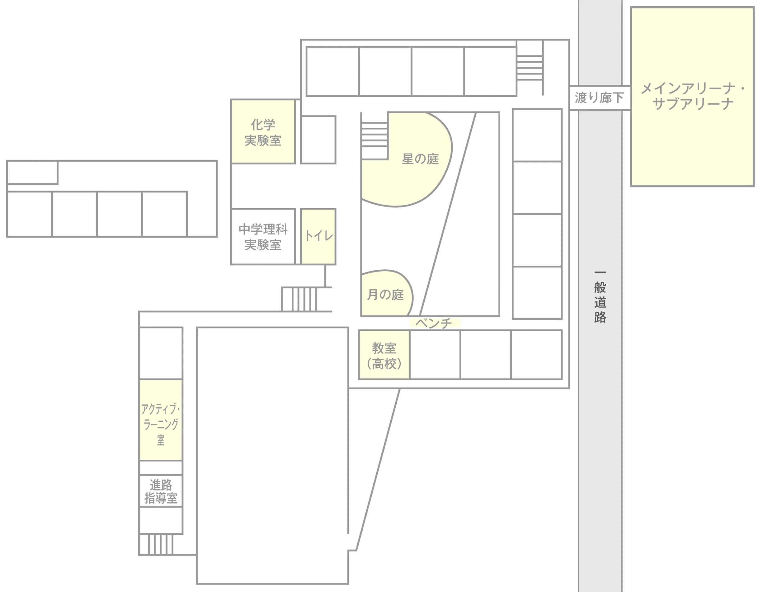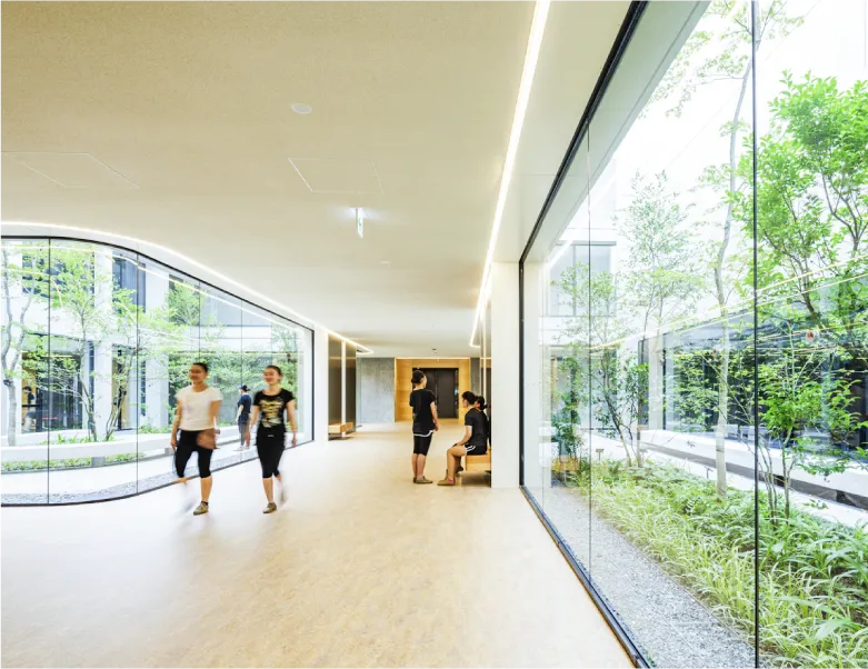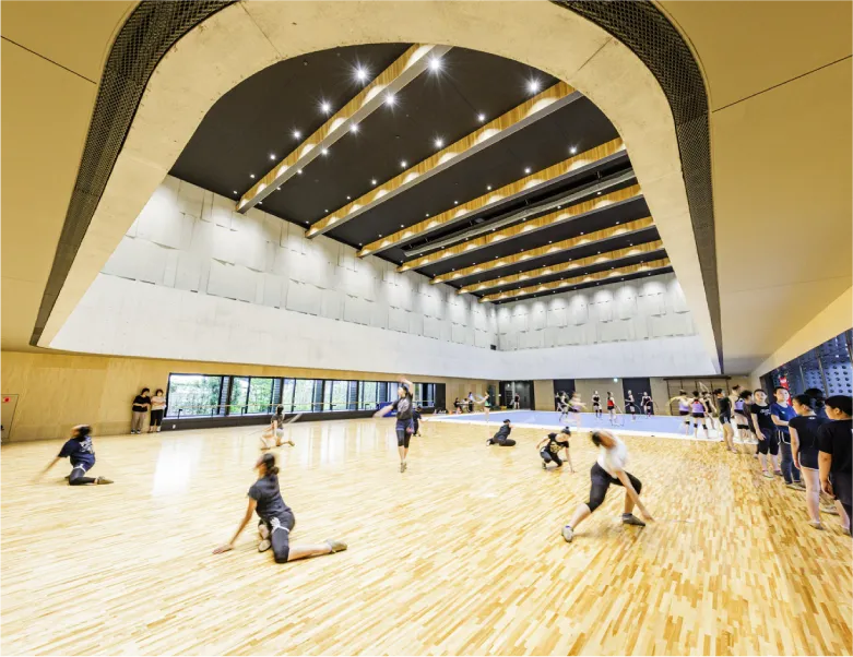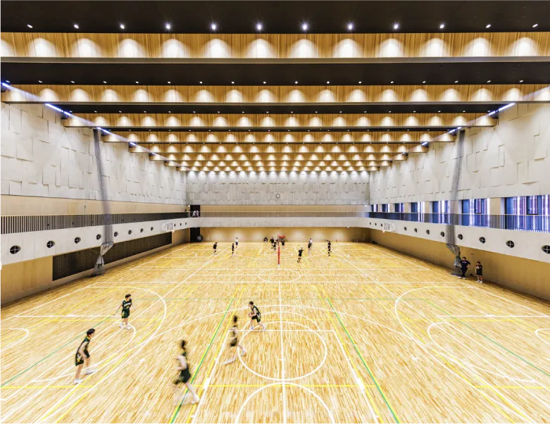 - 4つの体育施設(メインアリーナ、サブアリーナ、武道場、多目的室)からなる、空調設備を完備した新体育館。メインアリーナはバスケットコートが2面とれる他、トレーニングルームなども備えています。吹抜けや中庭を各所に設けた共有空間を中心に展開し、光、風、緑を感じることができる快適な環境で体育の授業や部活動に利用されています。