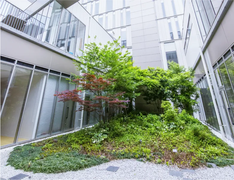 - 校舎の3階にある北側の空中庭園です。休み時間におしゃべりしたり食事したりできる、開放的なコミュニティスペース。ベンチには月の庭と同じく星座を模った石が埋め込んであります。校舎の至るところに緑があるので気持ちを和ませてくれます。
