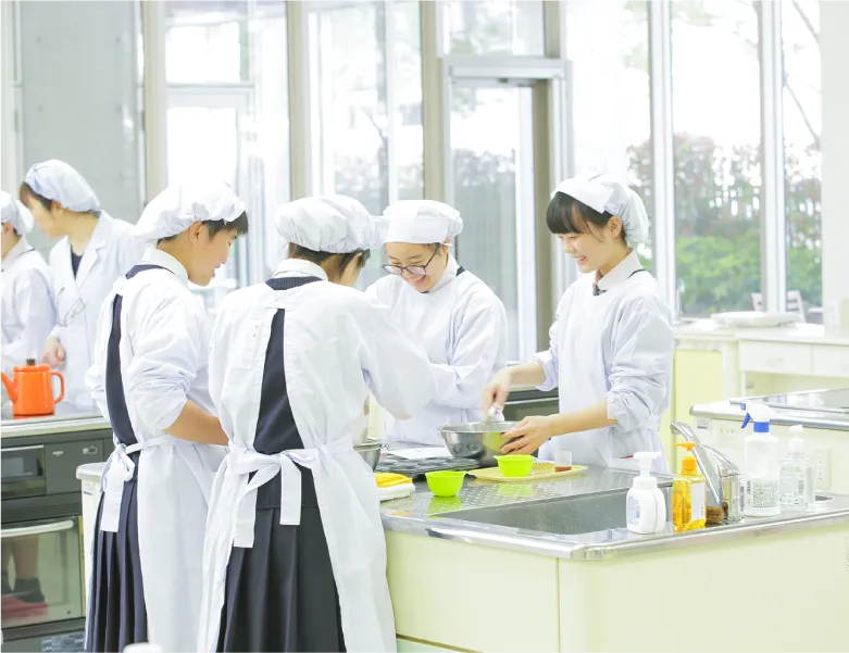 - 「食」は体づくりの基本として、本校では食育を大事にしています。調理示範室は、実習前に先生が手本を示す場所。白と赤を基調にした個性的な円形教室は、本校の食育のシンボルでもあります。