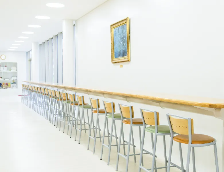 - 教務室(職員室)に近接したホワイエの一角に学習カウンターを40席設けています。授業の合間や放課後にちょっと先生に質問したい時など、この学習カウンターが便利です。