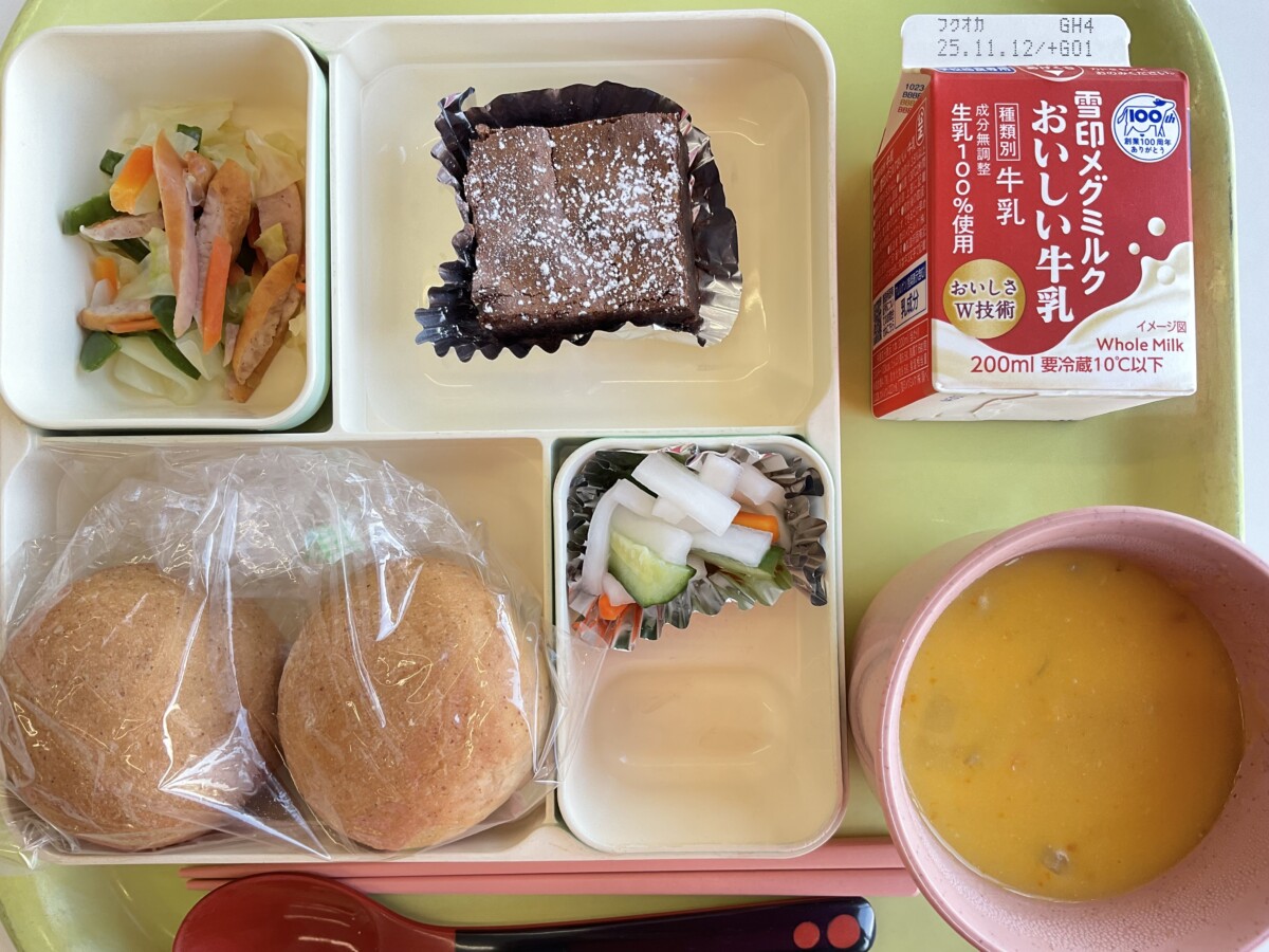 今日はハロウィンメニューです。ハロウィンにちなんでパンプキンシチューが登場します。南瓜をたっぷりと使ってコクのある一品にしています。ガトーショコラは手作りです。優しい甘さに仕上げています。