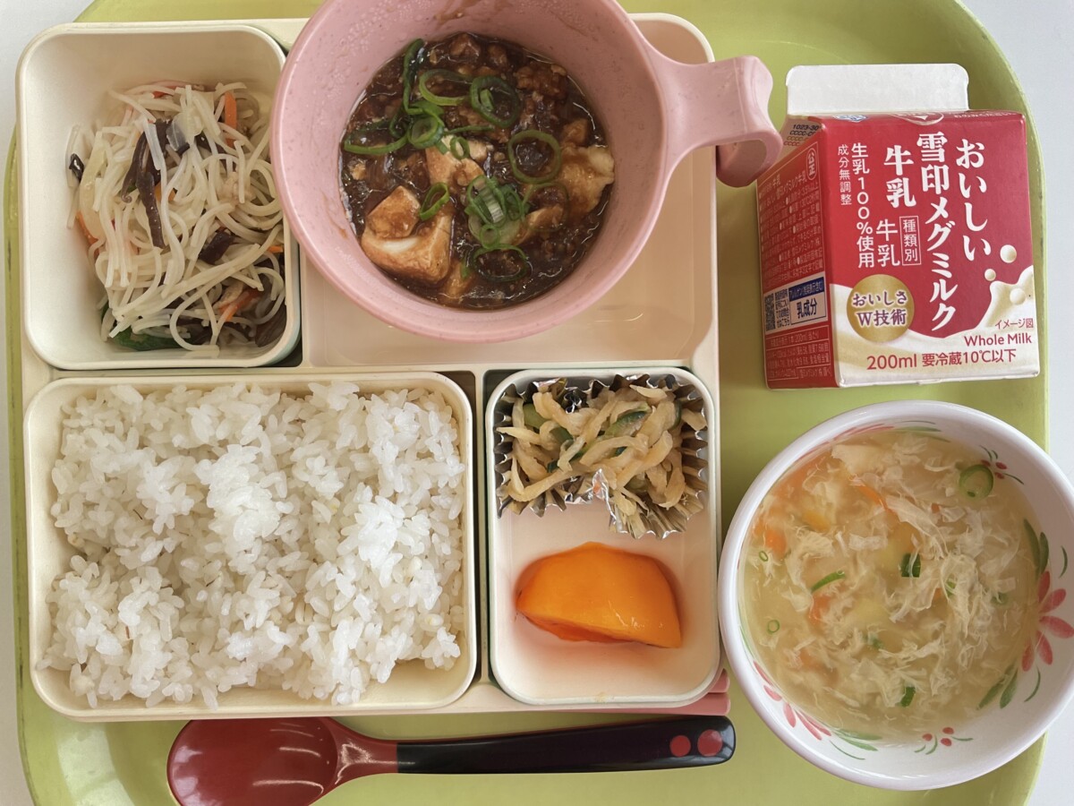今日は世界の料理の日で「タイ」です。ガパオライス、ヤムウンセンです。ガパオライスとは香ばしく炒めたひき肉に、ピリッとスパイシーなホーリーバジルを合わせた、タイを代表する定番の人気ごはんです。ヤムウンセンは春雨とひき肉のスパイシー炒めです。給食では食べやすいように味付けをアレンジしています。この機会に世界の料理を調べてみてくださいね。