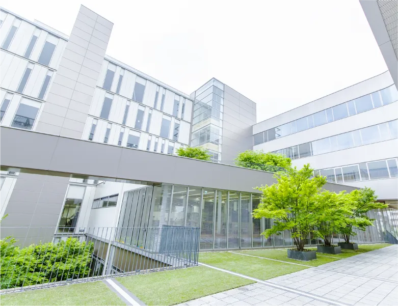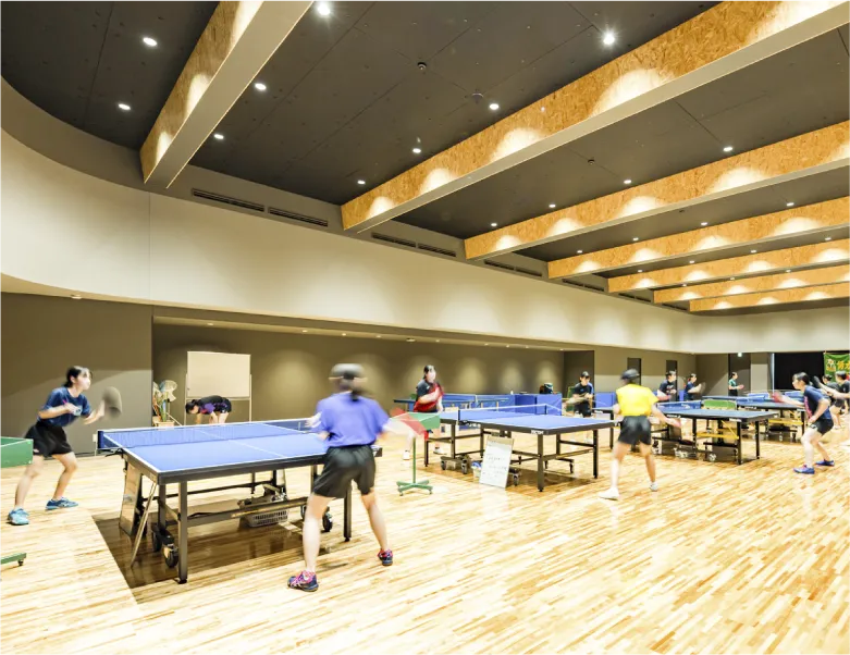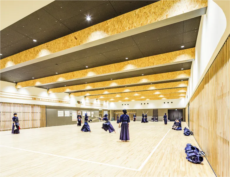 - 4つの体育施設(メインアリーナ、サブアリーナ、武道場、多目的室)からなる、空調設備を完備した新体育館。メインアリーナはバスケットコートが2面とれる他、トレーニングルームなども備えています。吹抜けや中庭を各所に設けた共有空間を中心に展開し、光、風、緑を感じることができる快適な環境で体育の授業や部活動に利用されています。