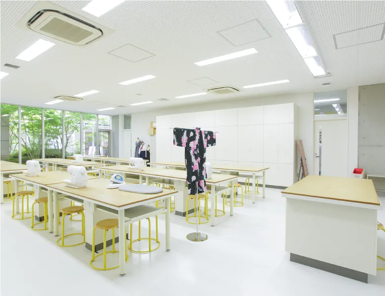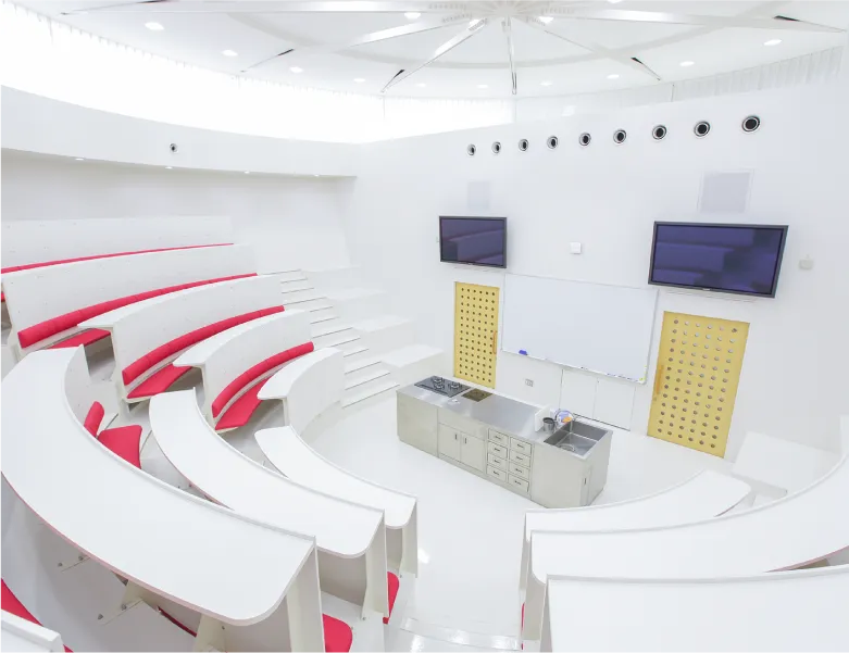 - 「食」は体づくりの基本として、本校では食育を大事にしています。調理示範室は、実習前に先生が手本を示す場所。白と赤を基調にした個性的な円形教室は、本校の食育のシンボルでもあります。