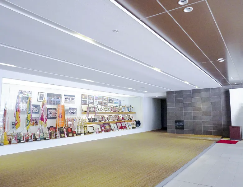 - エントランスホールには部活動の優勝旗、トロフィー、賞状などが飾ってあります。剣道、陸上、ソフトテニス、新体操、バスケットボール部等多くの部活がインターハイ等の全国大会で活躍しています。
