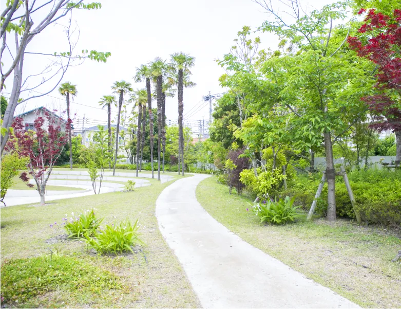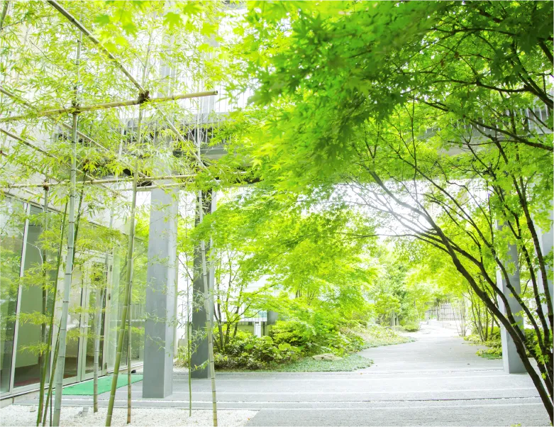 - 平成15年に寛仁親王がご来校記念でお手植えされた松が中学棟の和室の窓を開けると見ることが出来ます。紅葉、アジサイ、竹など様々な植物が植えてあり季節の変化を感じる和風庭園になっています。