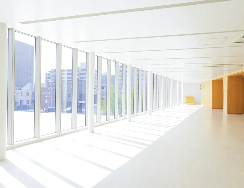 - 講堂入口前の全面ガラス張りになっている明るい日差しが差し込む空間です。学校説明会や入学式などのイベントでは、この空間が、受付場所になったりします。ここからは水仙の丘が一望できます。