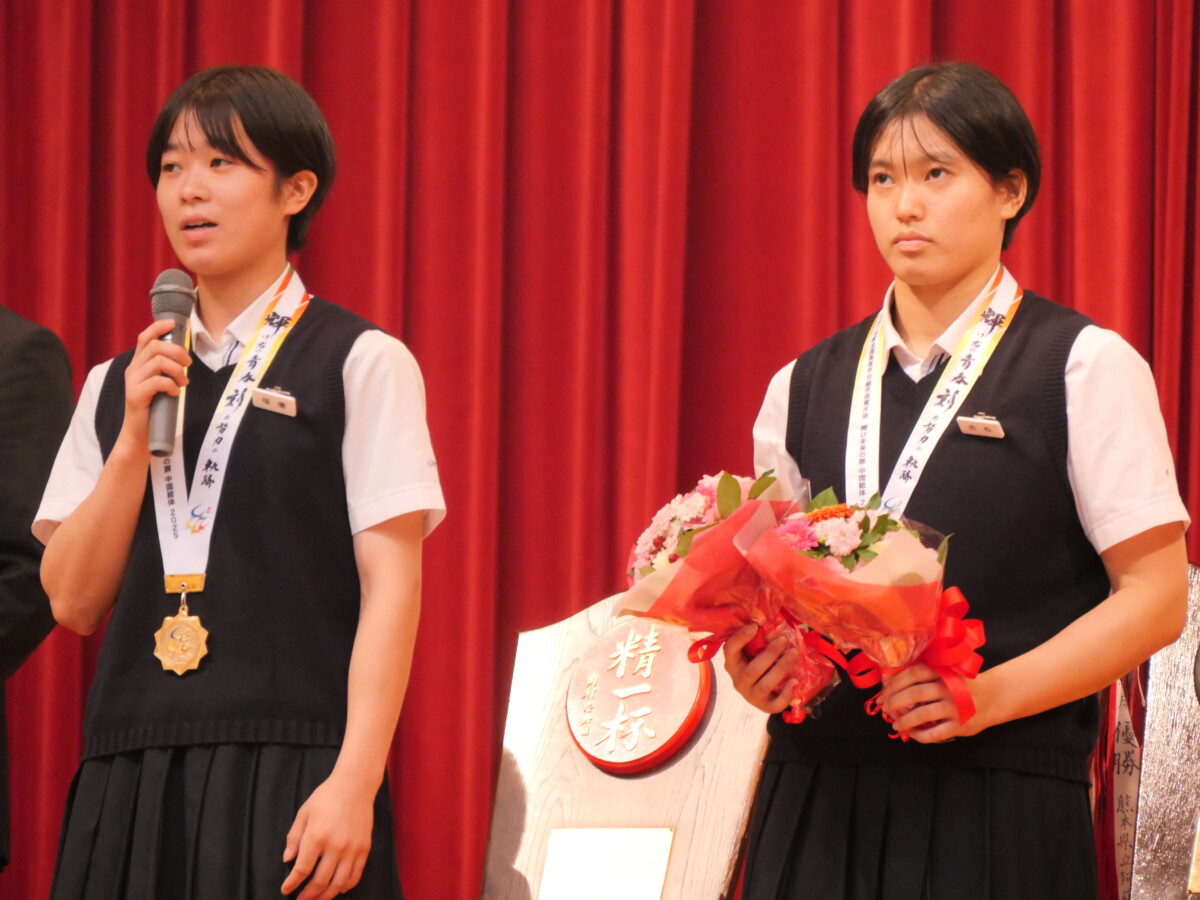 剣道部の優勝報告会では、岩城監督より、強豪校としての重責を背負いながら挑戦することの難しさ、そしてその中で大切にすべき心構えについてのお話がありました。「支えてくださる方々への感謝の気持ちを忘れずに持ち続けることが、前向きな姿勢や表情につながり、力となる」と語られました。