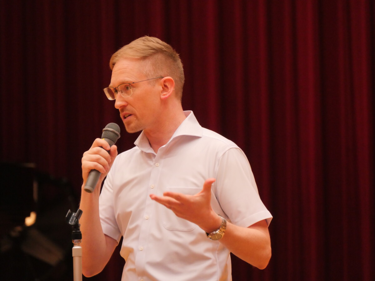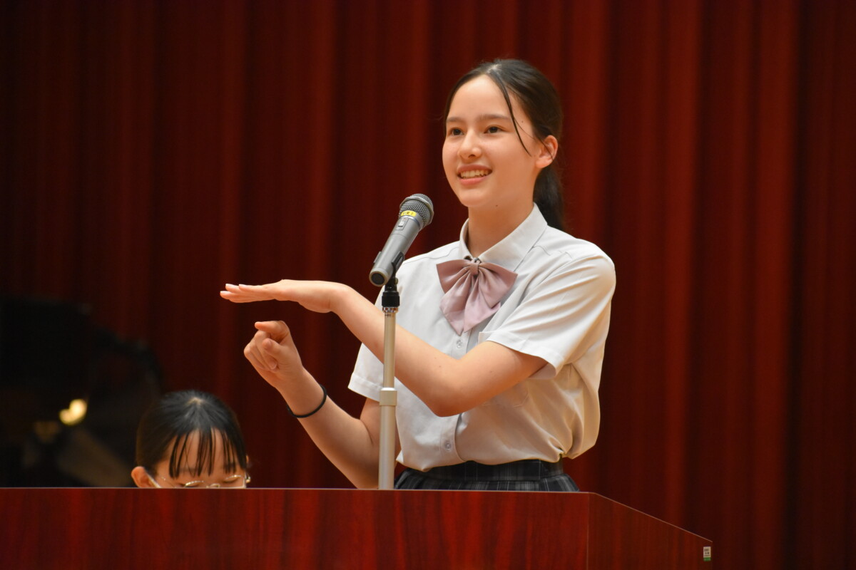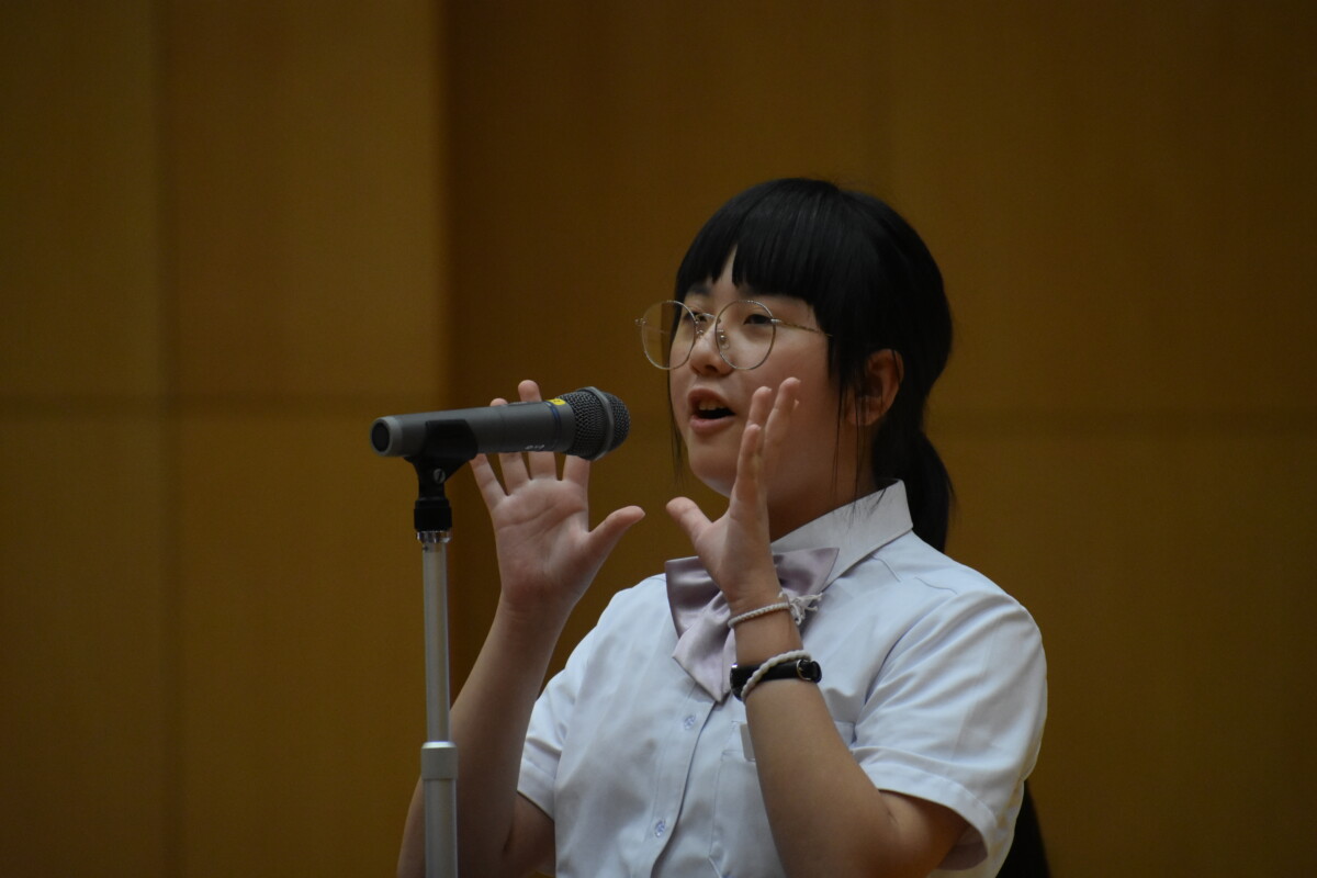 学年ごとに指定された英語課題文を暗記し、発表する形式で行われ、暗記力や発音の正確さに加え、表現力や演出の工夫も評価の対象となります。