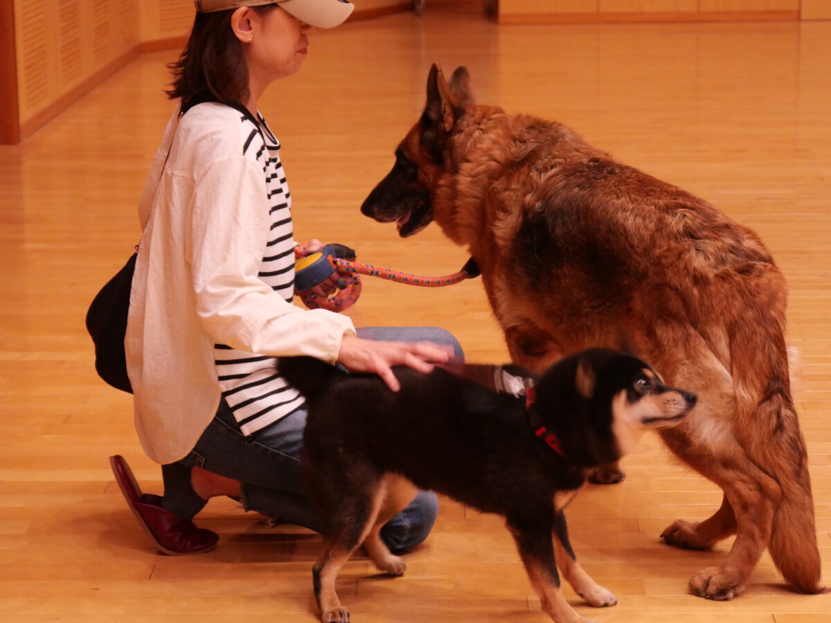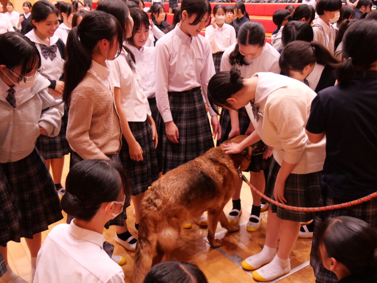 講演の最後には、実際に犬とふれあう時間が設けられ、生徒たちは笑顔で駆け寄り、楽しそうにふれあいながら命の尊さや動物との関わりについて学ぶことができました。