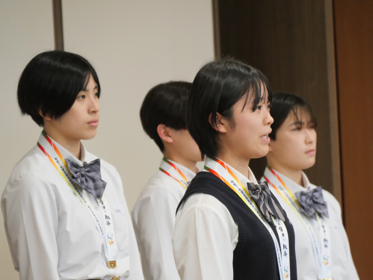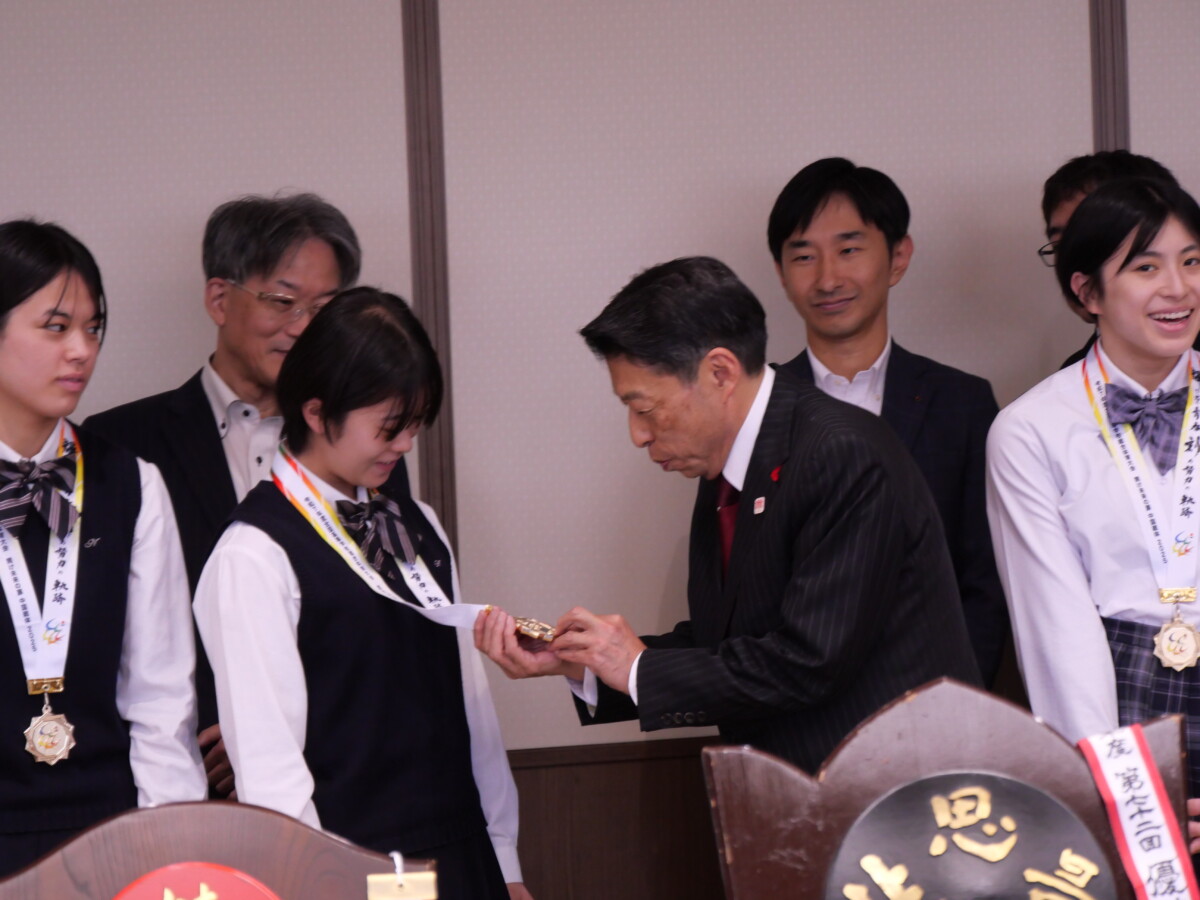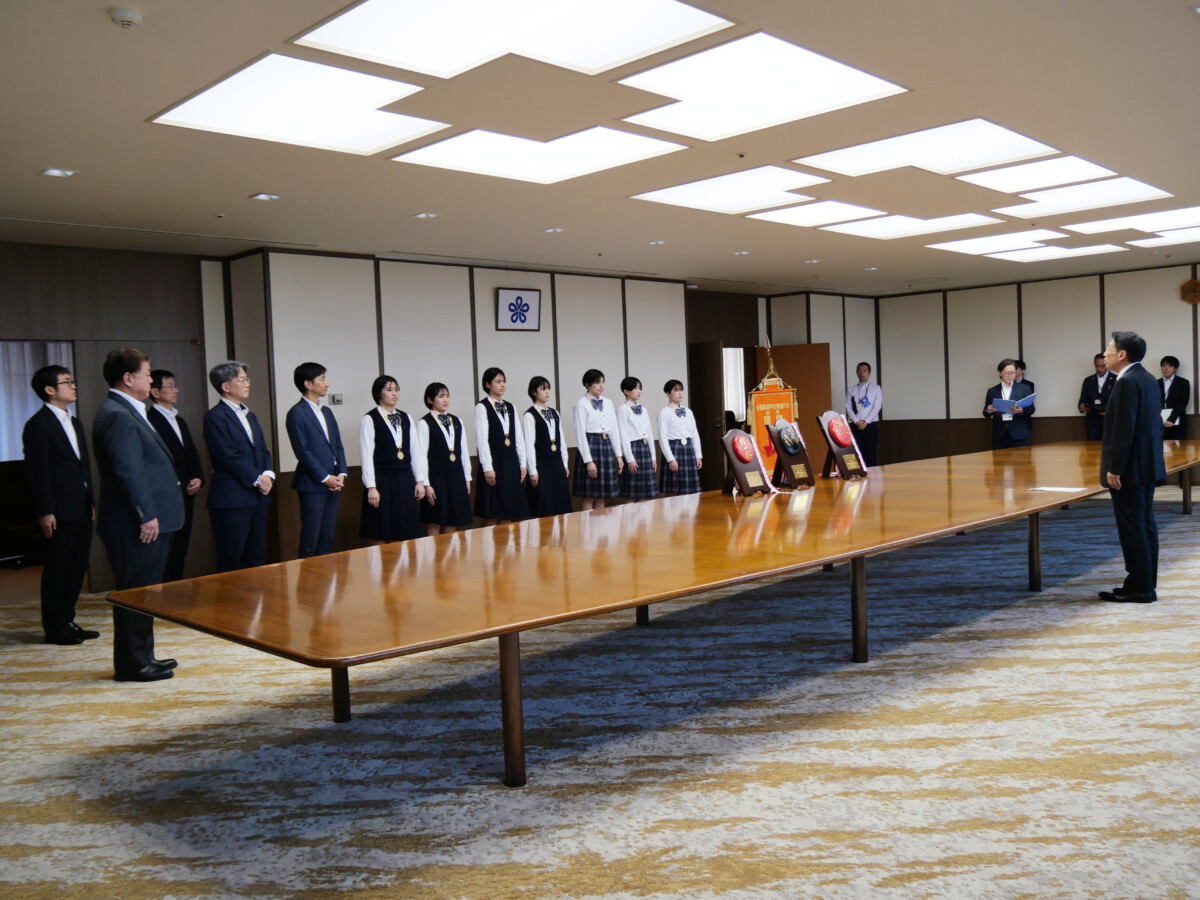 令和8年度に入学生より共学化を控えた節目の年に、中村学園女子高等学校としての最後のインターハイ出場となった今年、服部知事からは、長年にわたり受け継がれてきた合言葉「姉妹の絆」を胸に、互いを思いやり、支え合う精神を発揮して見事連覇を達成したことを、「素晴らしい成果」と称賛されました。