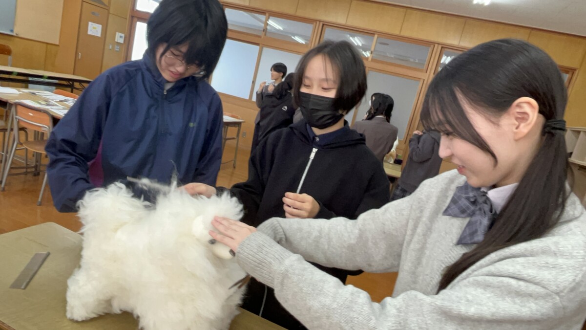 福岡ECO動物海洋専門学校の講師の方から動物看護、トリマー、ドックトレーナー等動物と関わる仕事の一部を小型犬と一緒に学びました。トリマー体験では練習用カットモデル犬を使い実際にハサミを使ってカットしていました。飼い犬の犬種にあったカットの方法等の質問もとっびかっていました。生徒達は優しい笑顔で接していたのが印象的でした。