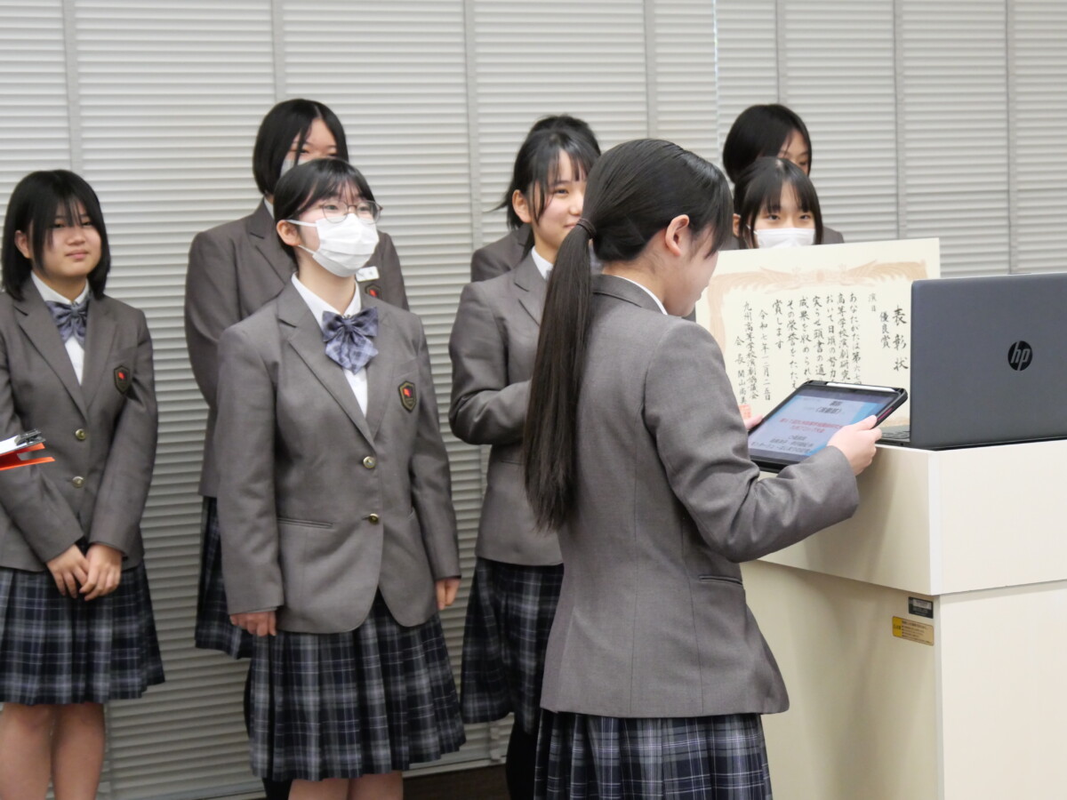 続いて、生徒の活動について表彰が行われました。今回は「演劇部」「書道部」「美術部」が優れた成績を収め素晴らしい成果を挙げています。また、中学生が城南区市民アート展のグラフィックデザインに関する表彰を受けました。