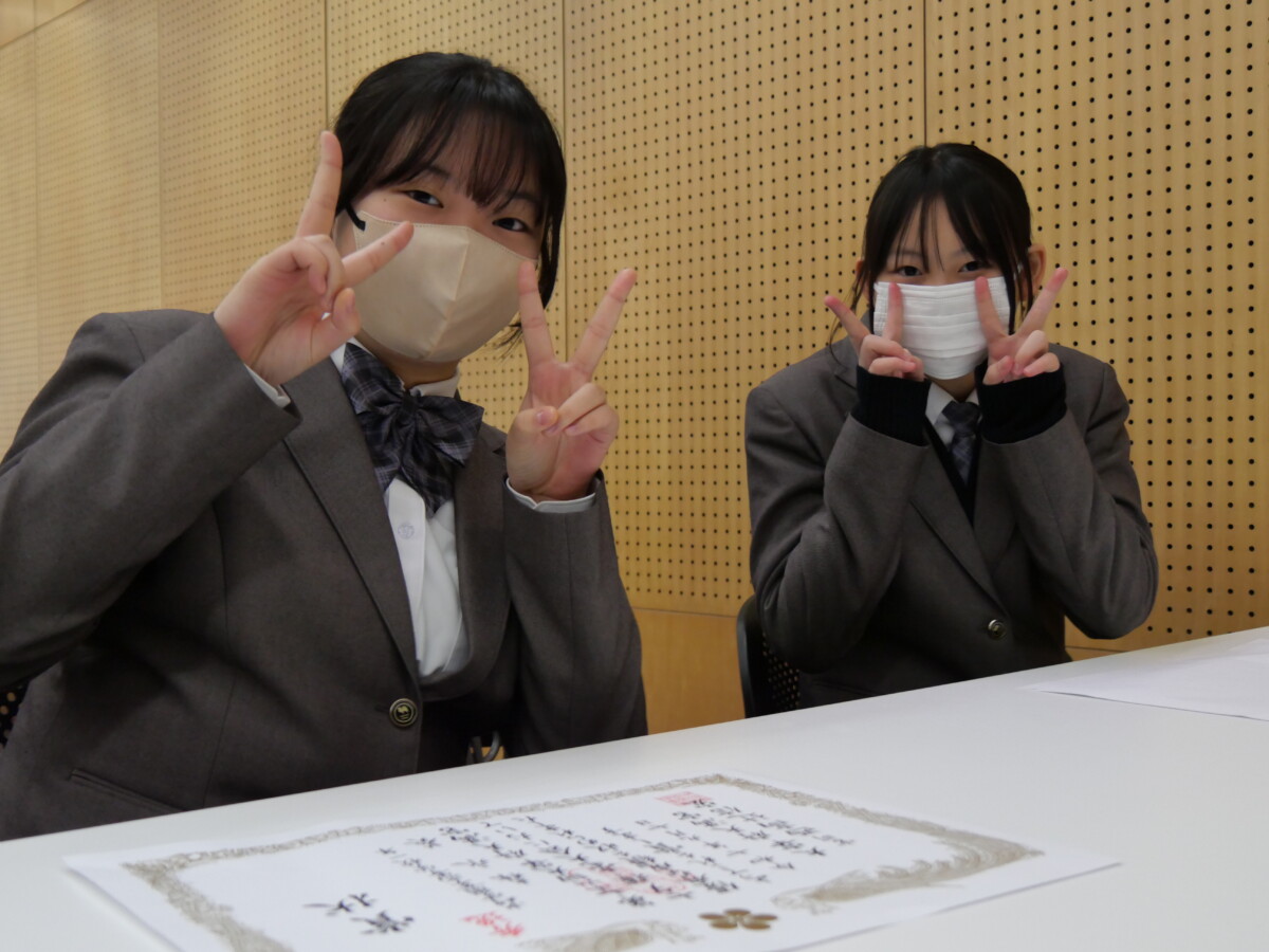 書道部 第76回大宰府天満宮七夕揮毫大会 秀逸(左)森永葵さん 金賞(右)丸山詩織さん