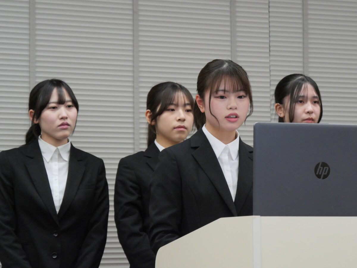 始業式終了後には、中村学園大学短期大学部キャリア開発学科【フードロス削減チーム】の学生4名が来校し、フードロス削減に向けた取り組みが紹介され、併せて1月28日(水)に本校で実施されるお菓子のポップアップ販売についての案内がありました。