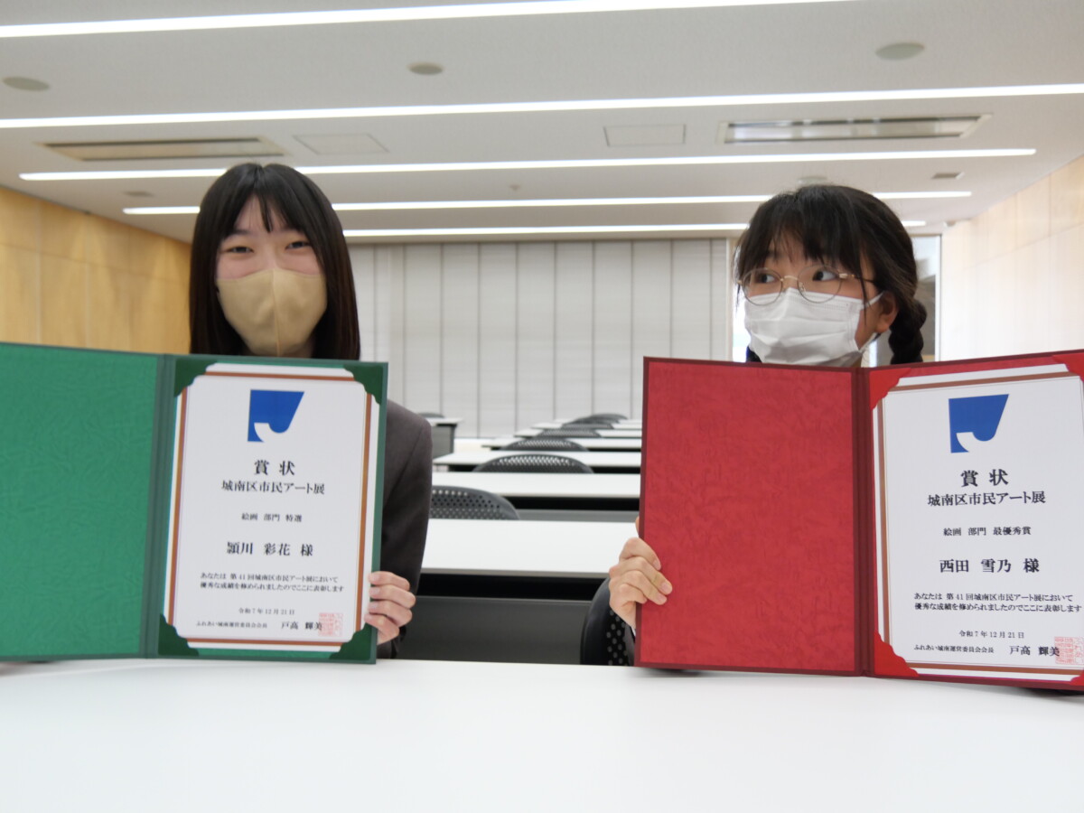 美術部 第41回城南区市民アート展 絵画部門 特選(左)頴川彩花さん 最優秀賞(右)西田雪乃さん