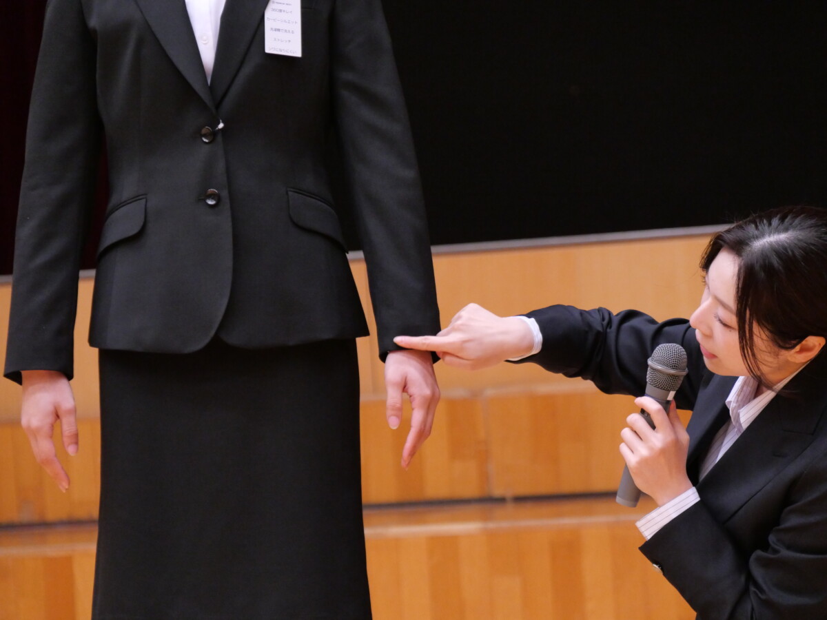 また、生徒の代表1名が実際にスーツを着用し、具体的な着こなし方を指導していただきました。
