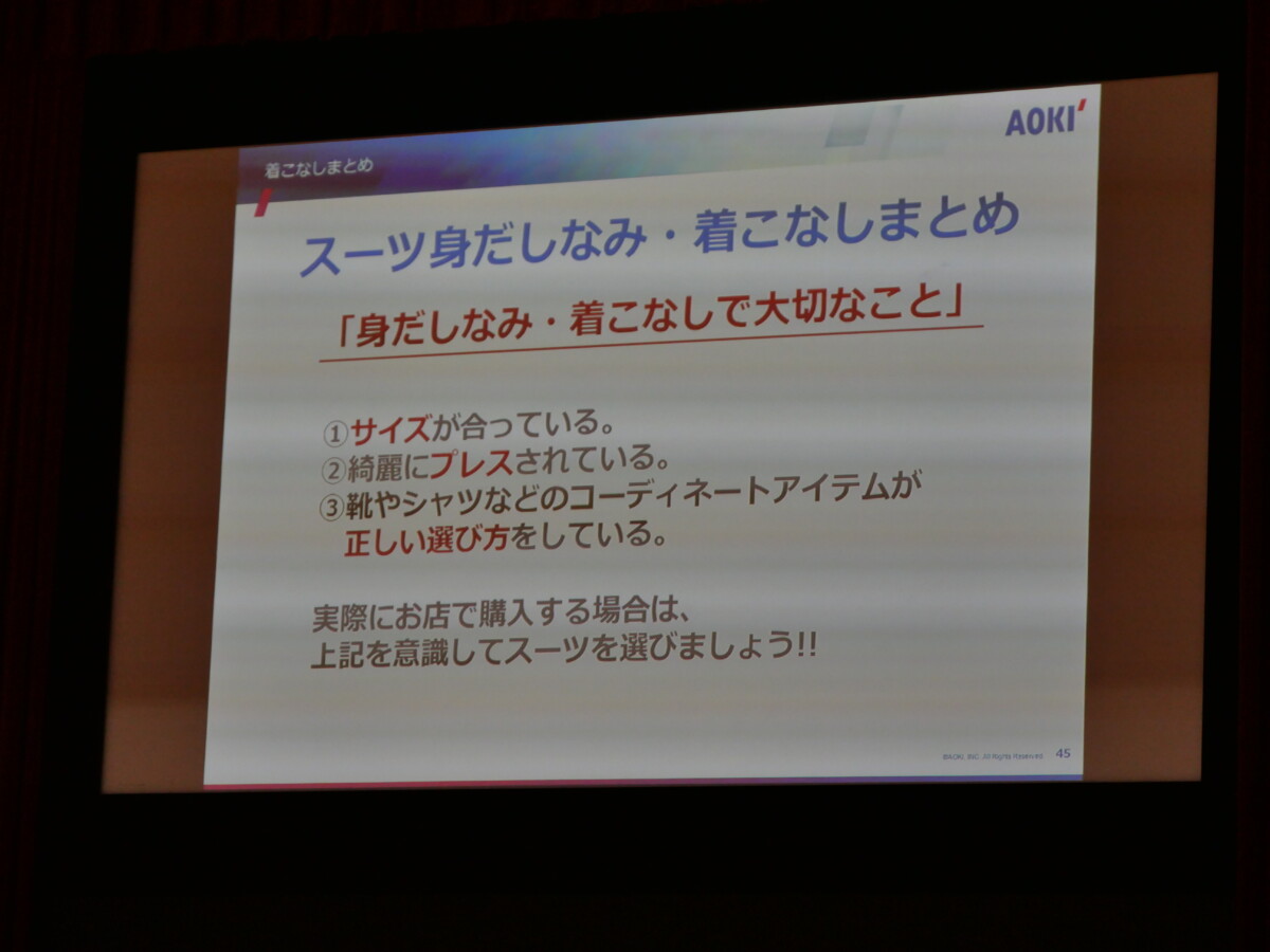 本日は、株式会社AOKI様より講師の方をお迎えし、スーツの選び方や着こなしのポイント、フォーマルとの違い等について教えていただきました。