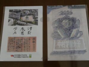 完成した航空写真は、女子校最後の年を記録する記念クリアファイルとして制作し、全校生徒へ配付されました。