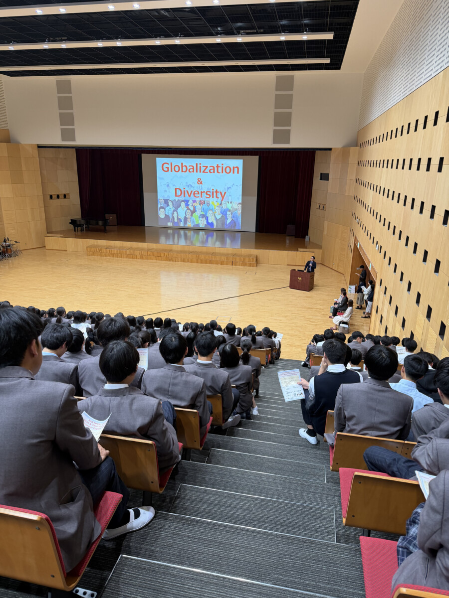 また、本校では、海外研修や国内英語研修に加え、日常的に国際感覚を育むための多様なグローバル教育プログラムを展開しています。高校1年生次では、立命館アジア太平洋大学(APU)の国際学生と協働する「グローバルキャンパス」を実施し、英語での交流や多様な価値観に触れる機会を設けています。